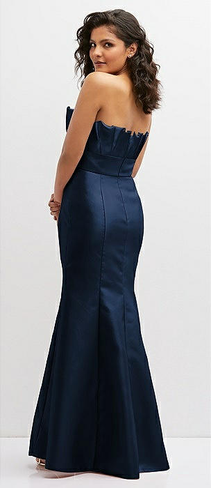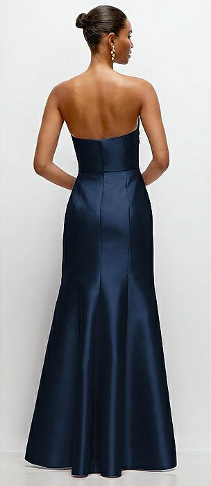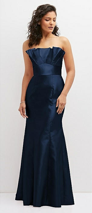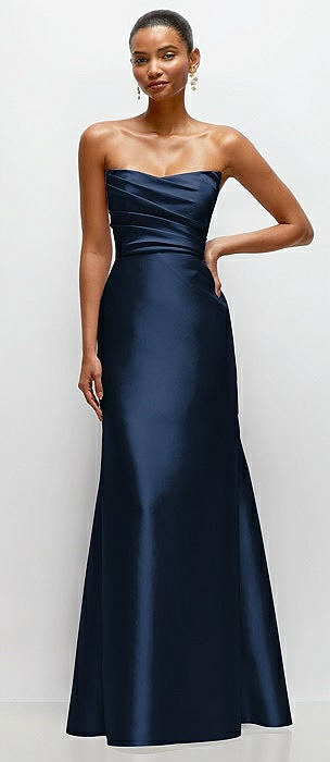 Strapless Cat-Eye Draped Bodice Satin Tumpet Dress in midnight navy