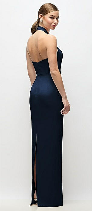 High-Neck Halter Stretch Satin Maxi Dress with Bias A-line Skirt in midnight navy