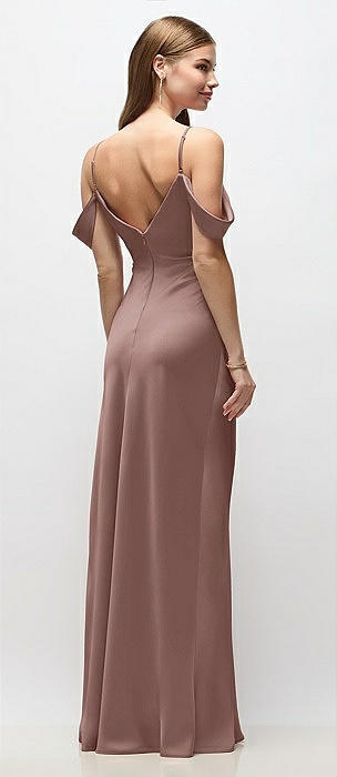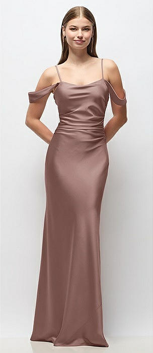 Off-the-Shoulder Swag Ruched Side Satin Bias Maxi Dress with Adjustable Spaghetti Straps in sienna