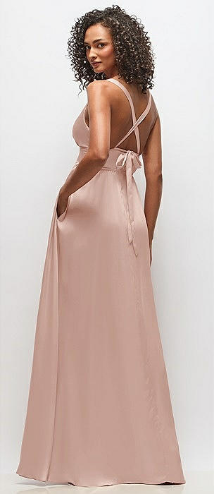 Draped Satin Grecian Column Gown with Convertible Straps in toasted sugar