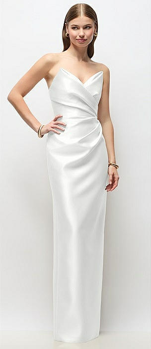 Strapless Asymmetrical Draped Satin Column Maxi Dress in white