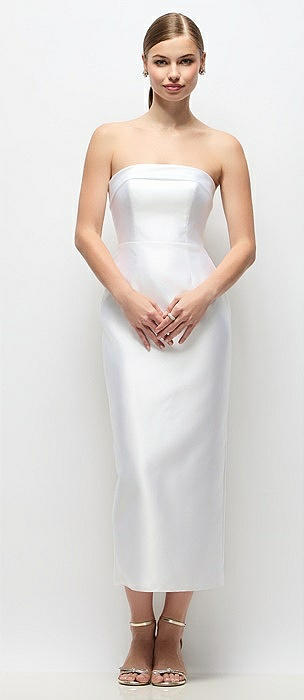 Strapless Cuff Satin Midi Dress with Column Skirt & Back Bow in white