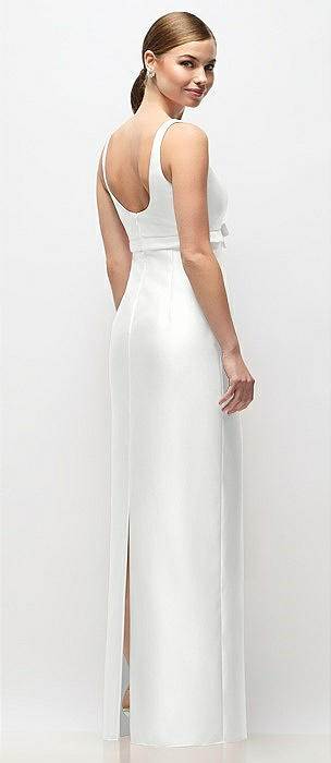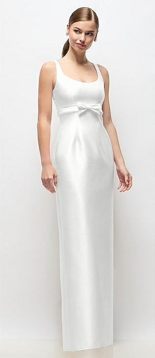Scoop Neck Satin Column Maxi Dress with Bow at Empire Waist in white