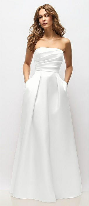 Strapless Hand-Pleated Bodice Satin Maxi Dress with Full Pleated Skirt in white