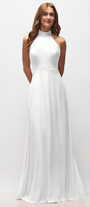 High-Neck Halter Open-Back Satin Trumpet Dress in white