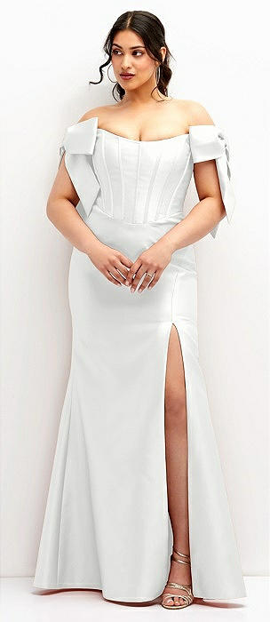 Off-the-Shoulder Bow Satin Corset Dress with Fit and Flare Skirt in white