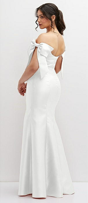 Deep V-back Satin Trumpet Dress with Cascading Bow at One Shoulder in white
