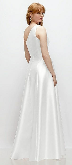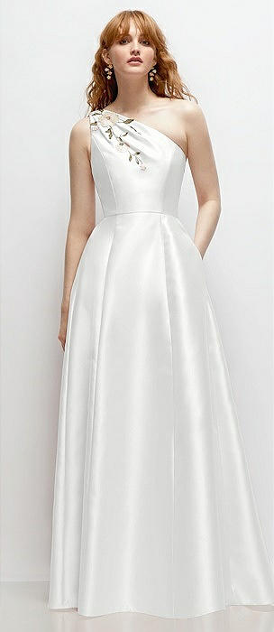 One-Shoulder Full A-Line Satin Gown with Handworked Floral Appliqué in white
