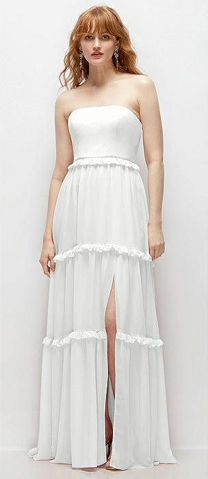 Strapless Chiffon Maxi Dress with Tiered Micro Ruffle Full Skirt in white