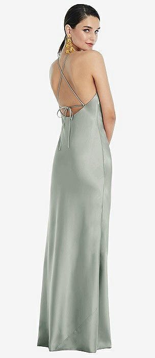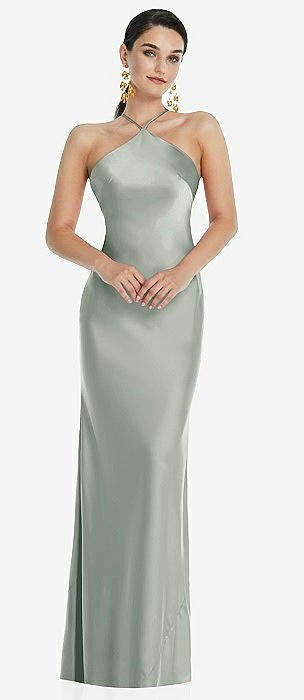 Cowl-Neck Open Tie-Back Stretch Satin Mermaid Dress with Slight Train in willow green